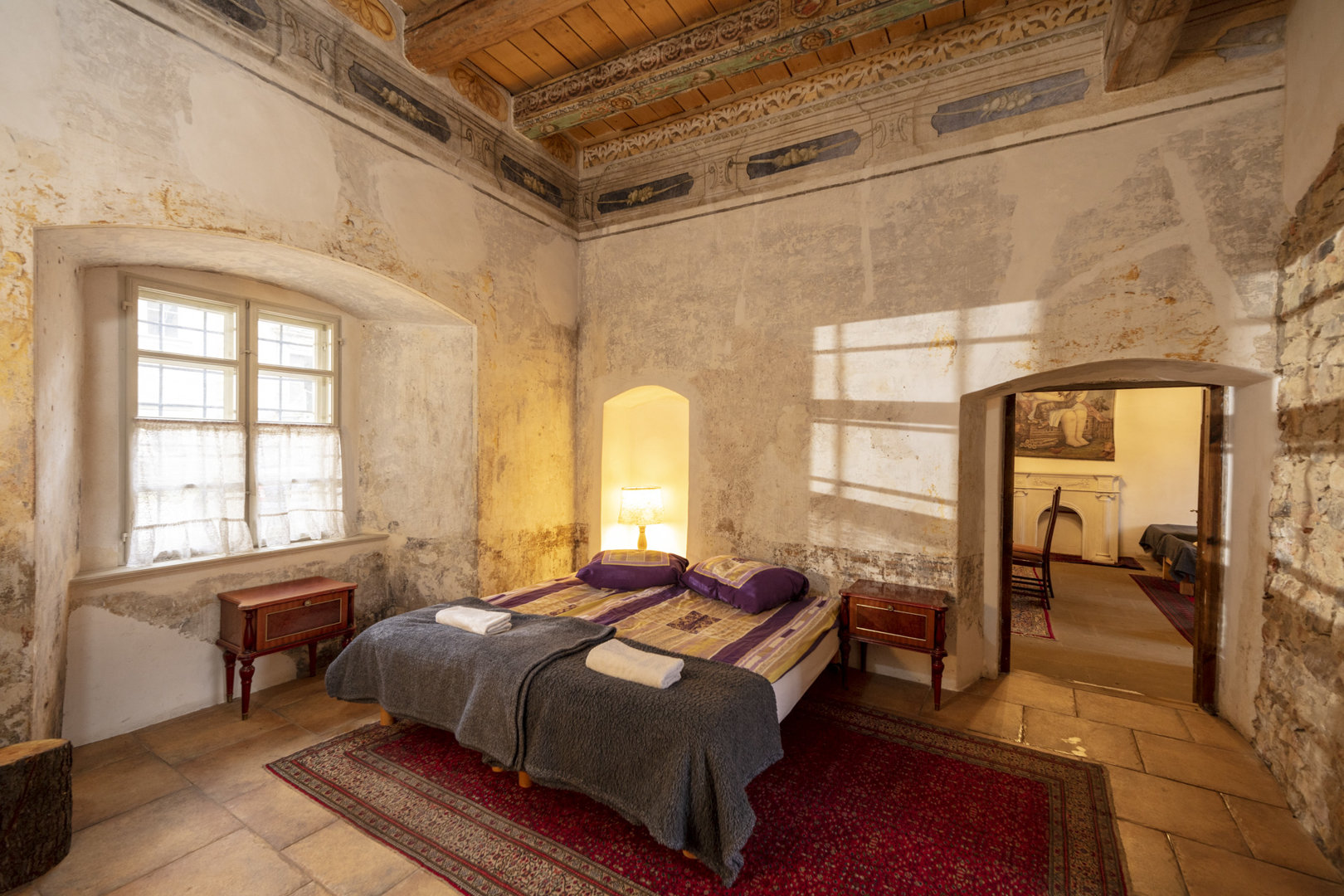 Komnata Luizy to obszerny 2 osobowy pokój z dużym, podwójnym łóżkiem i łazienką. Jest możliwość wstawienia dodatkowego łóżka lub łóżeczka dla dziecka. Ściany zdobią XVII wieczne, odrestaurowane freski. Pokój znajduje się na 1 piętrze głównego budynk